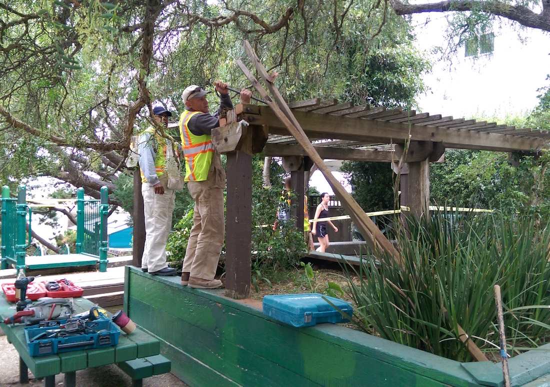NOT SO FAST! The funding is NOT in place. We are working with the city to get an estimate to replace the trellis AND the planter box AND the benches—all of which cannot be replaced individually because of the design of the structure. We will keep Bernalwood informed. It ain’t over ’til it’s over!