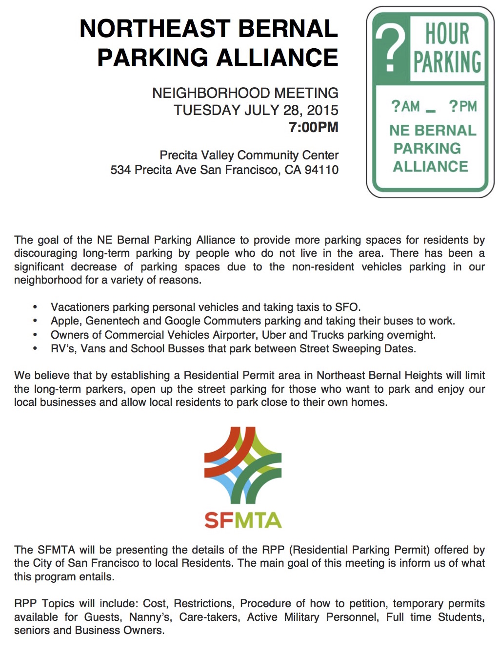Neighbor MM spotted handbills from the so-called “Northeast Bernal Parking Alliance” drifting around Precitaville. Apparently, there’s a meeting tonight, Tuesday, July 28 at 7 pm at the Precita Valley Neighborhood Center to discuss a proposal to turn much of North Bernal into an official Residential Permit Parking (RPP) zone. Neighbor MM writes:
