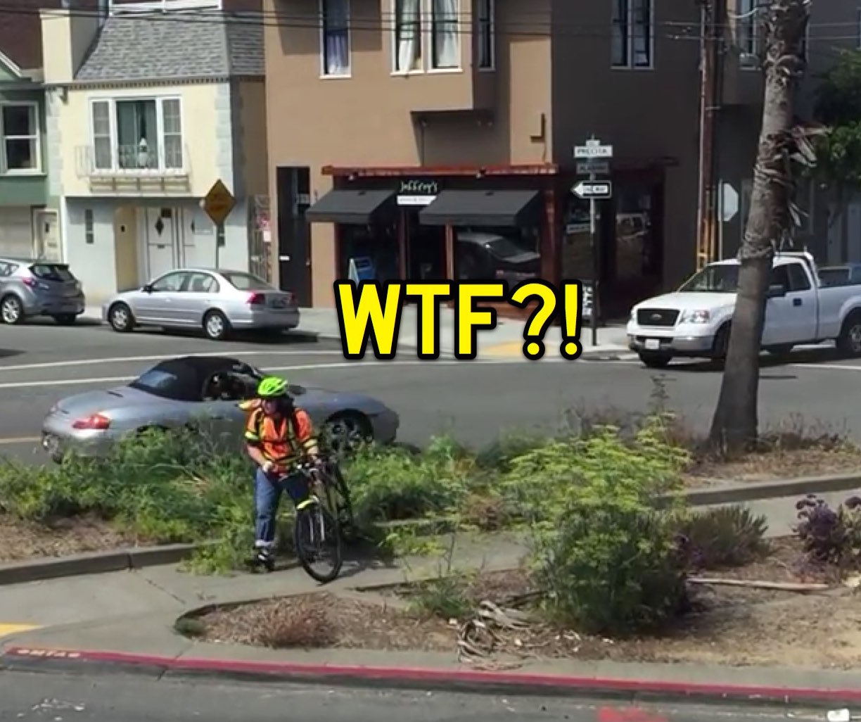 HAHAHA! I am laughing because I think I see both perspectives. Note: I said I think, because I can only make an assumption here. It really does look like this person is destroying the plants, but I drive and also bike ride this corner every day and due to this every-day experience, I know those tall plants obstruct the view for drivers at the stop sign going West on Precita (basically going toward the park). So I assume the bike rider is probably fed up with almost being hit and not being seen at this intersection. And if that’s the reason for the destruction, I can understand it. At that intersection, bikes that are coming down the hill on Alabama street are not easily seen by drivers going West on Precita due to the tall plants. That’s my theory.