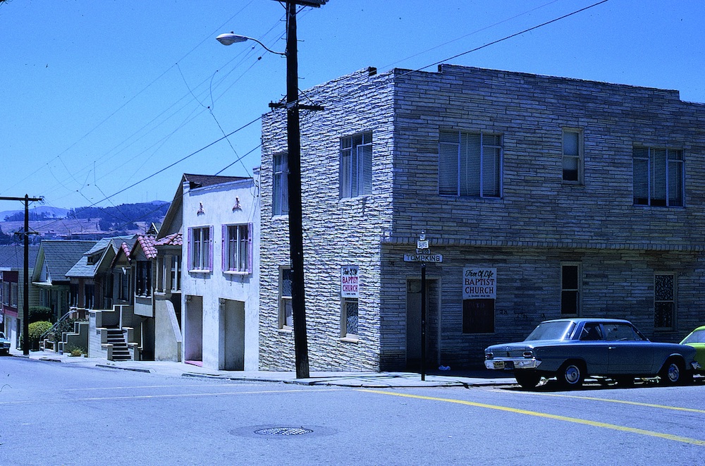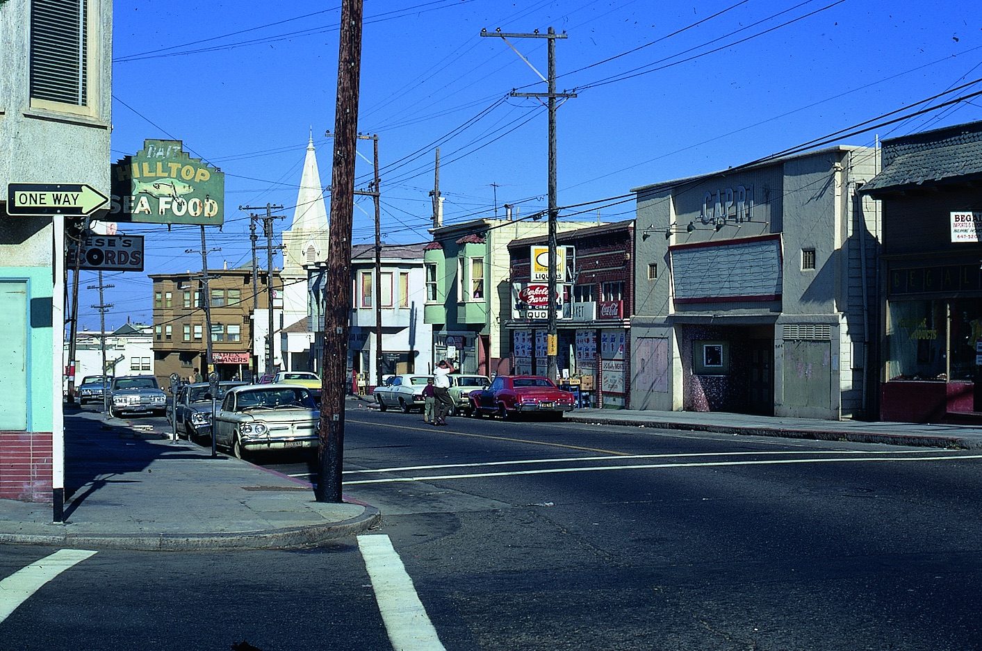 Sometime in the 1970s, the Capri Theatre building became the Victory Fellowship Bilingual Foursquare Church. The Assembly Church of God at Folsom and Cortland had a major fire in 1979 and is now gone. On the left side, Hilltop Sea Food has been replaced by Pay Little Market, which is still there today.