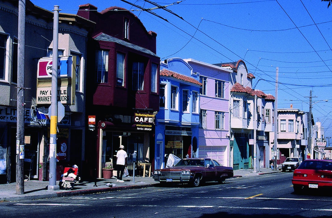 Notable for being one of the few photos of Cortland Avenue’s gas station, which was replaced with lawyers’ offices in the early 1980s. On the corner of Ellsworth and Cortland is a self-service laundromat that will be replaced by Martha and Brothers in 1999. The Shoe Clinic next door is now part of Tacos Los Altos.