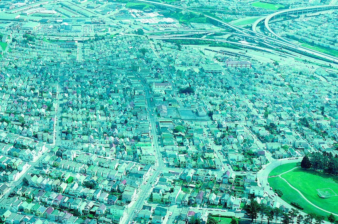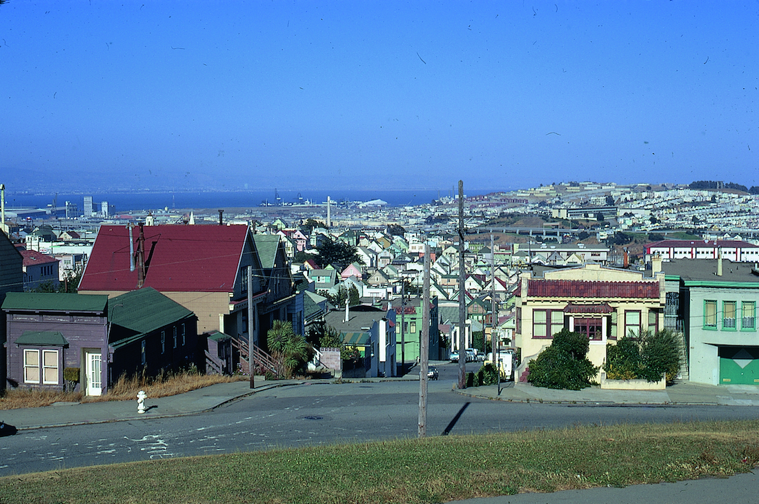 You get a good idea of the topography of Bernal in this one, as well as the development on the south side. Cortland Avenue runs down the middle of the photograph; the large buildings visible are Paul Revere School, the Bernal Library, and St. Kevin’s Church. Holly Park is in the lower right corner. Just visible beyond St. Kevin’s is the Emmanuel Lutheran Swedish Church building at Cortland and Folsom, which was then the Community Church Assembly of God.