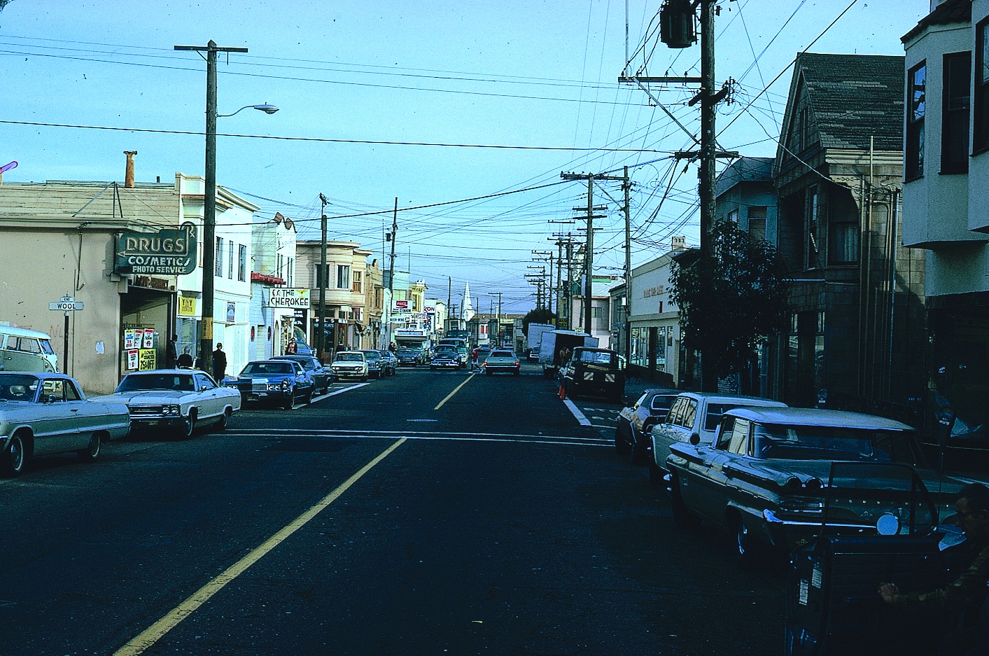 You can see the white steeple of the Assembly of God church at Folsom and Cortland, while the second building on the right is the former Capri Theatre, which closed in 1969. Behind the church in the brown building is Apex Cleaners and Dyers at 1000 Cortland, which opened in the early 1950s. Cutting Edge Salon has been in this spot since 1999.