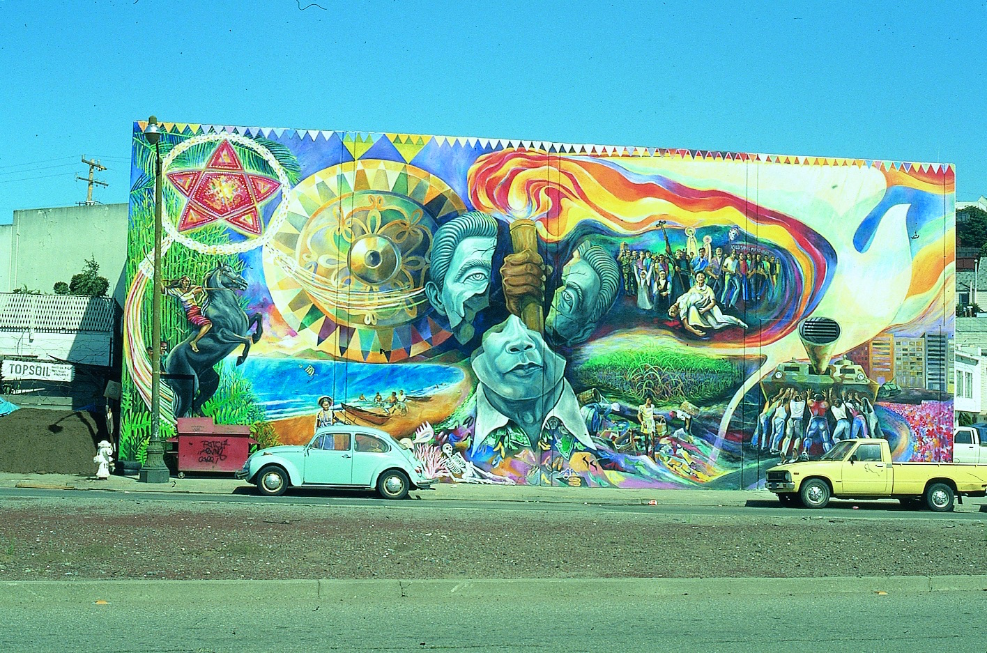 This was an anti-Ferdinand Marcos mural on the former Sun Valley Dairy building at 300 Alemany (at Crescent). Painted by Johanna Poethig (who recently did the “Story Cloud” mural on the back of the Bernal library), Vic Clemente, and Presco Tabios. Commissioned by the San Francisco Mural Resource Center, it commemorates the 1986 revolution in the Philippines. Facing south, it was allowed to fade before being painted over in 2006.