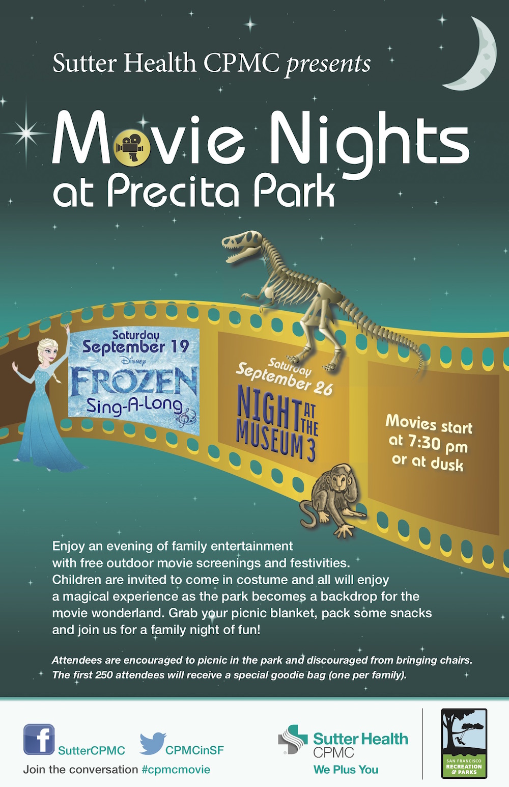CPMC invites Bernal Heights to come out for an evening of family entertainment, with free outdoor movie screenings and festivities in Precita Park starting at 7:30 pm or dusk: