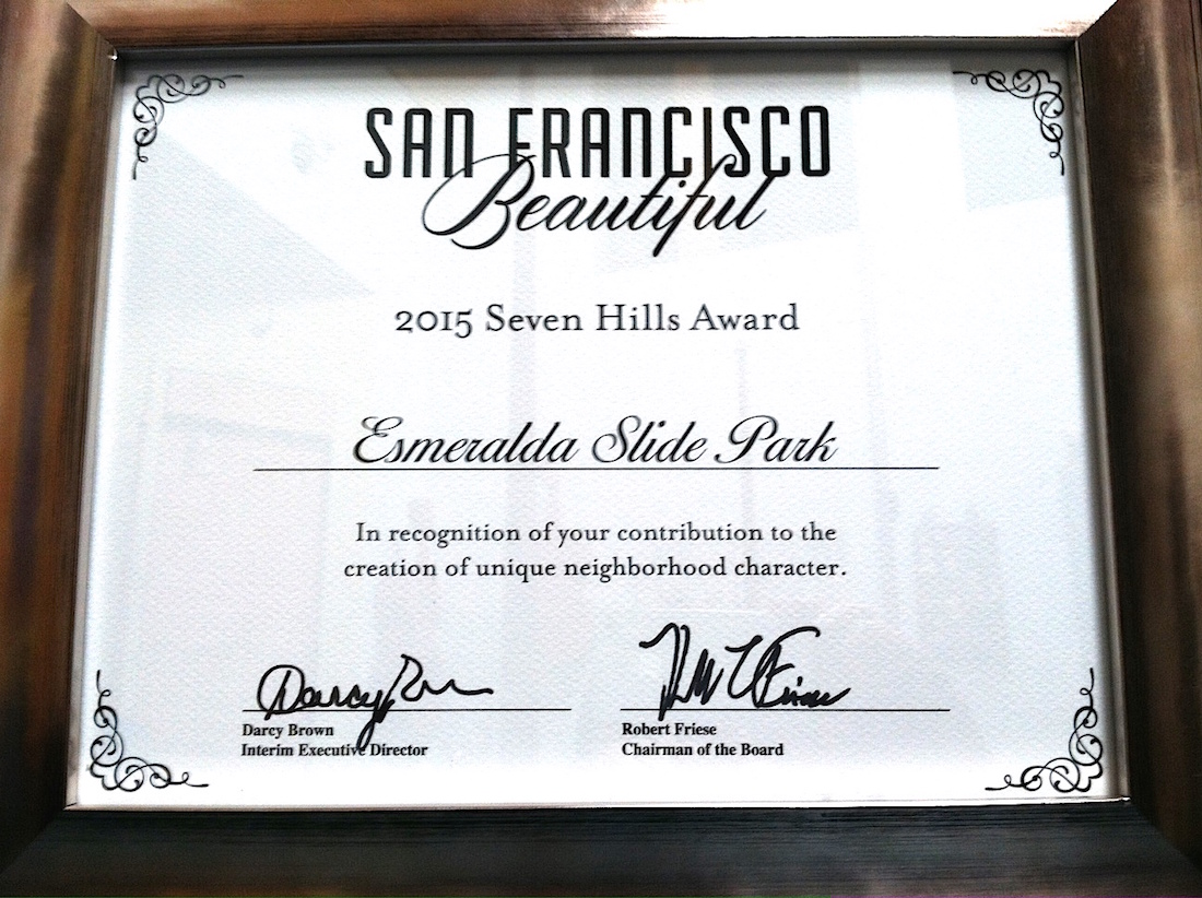Being a nominee was cool enough, but Esmeralda Slide Park just went on record as the 2015 recipient of the Seven Hills Award. This Award “recognizes nominees who have made a significant contribution to the creation of unique neighborhood character.”