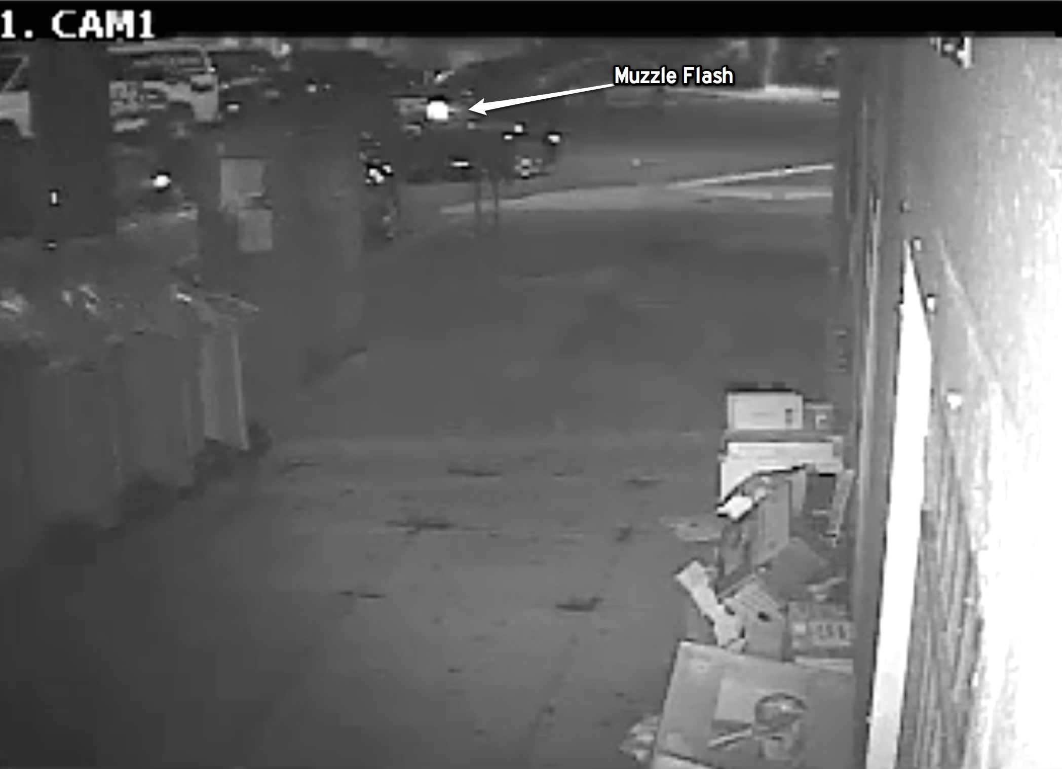Pay close attention to the car that appears in the first few moments of the video. You can see several muzzle flashes, and broken glass falling to the ground: