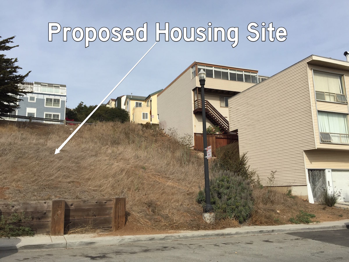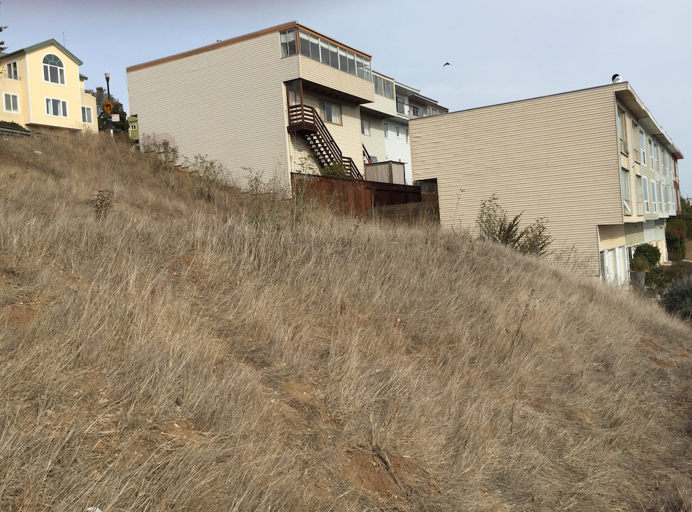 “This lot is one of the last open space hillsides on East Slope of Bernal, and offers commanding views to pedestrians, bike riders, car passengers, and commuters on the 67 Bernal Heights bus.