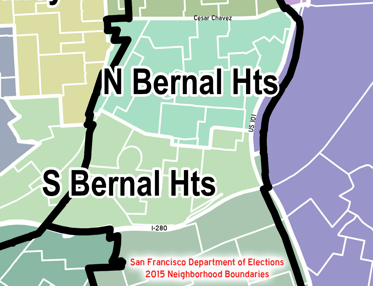 The difference in the result between North and South Bernal prompted Todd to wonder how the Dep’t of Elections defines the two voting districts. As you can see in the Election Departmment map shown above, North Bernal includes the more left-leaning microhoods in west Bernal and around the summit of Bernal Hill, while South Bernal includes the more centrist St. Mary’s microhood, along with some of our ancestral kin from the Bernal Glen area on the other side of the Bernal Cut.