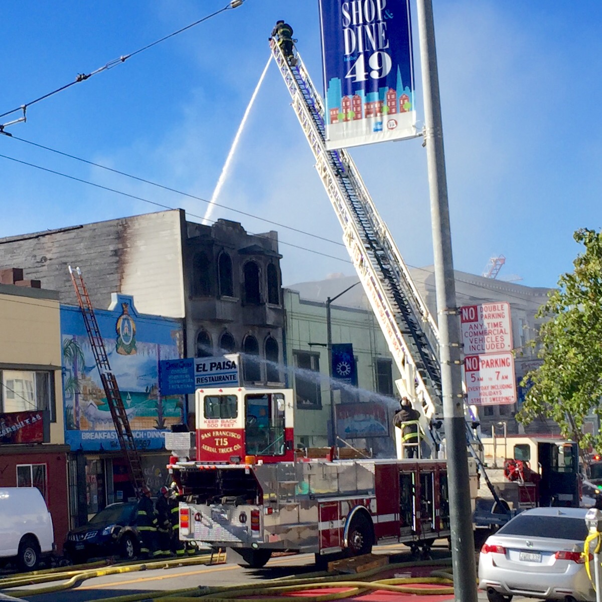 A five-alarm fire broke out this afternoon at around 3 pm on the 3300 block of Mission Street, near 29th Street. Initial reports indicate the fire began in 3318 Mission, the building that houses the Playa Azul restaurant.