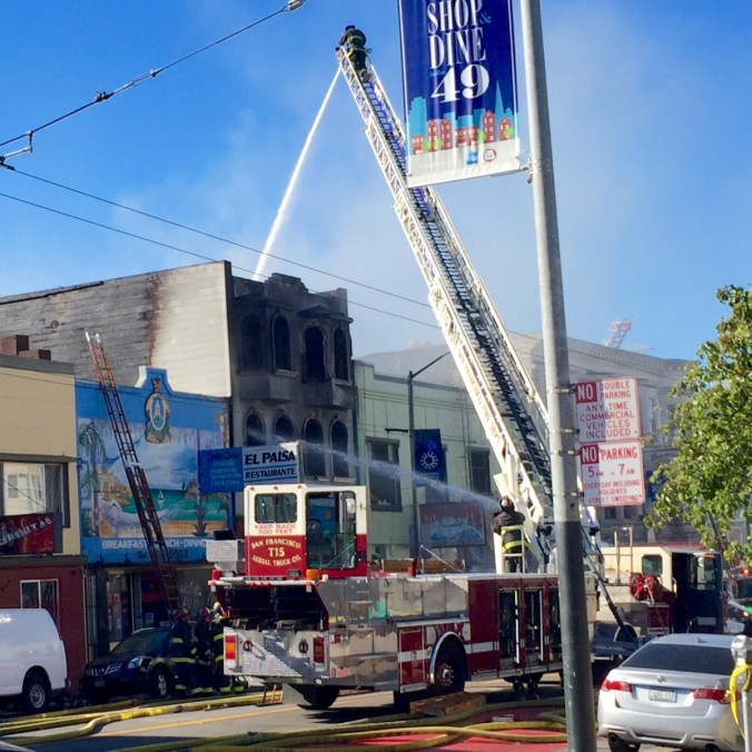 Sadly, many won’t be going home soon. MissionLocal shared a photo of the scene from street level on Mission. Playa Azul and Cole Hardware were gutted by the fire. Taco Loco looks badly damaged, along with the residences above in the Graywood Hotel.