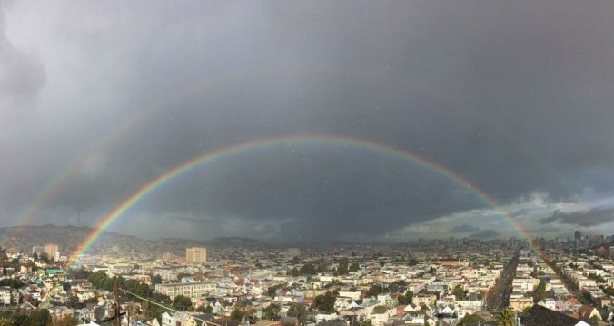 Meanwhile, in Bernal, Neighbor K. shared this reverse view of a rainbow touching down somewhere near Christopher’s Noe Valley observation post: