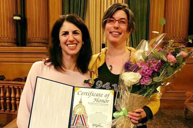 Neighbor Eden Stein (right) wearing a stylish 94110 ensemble while receiving her commendation from D9 Supervisor Hillary Ronen.