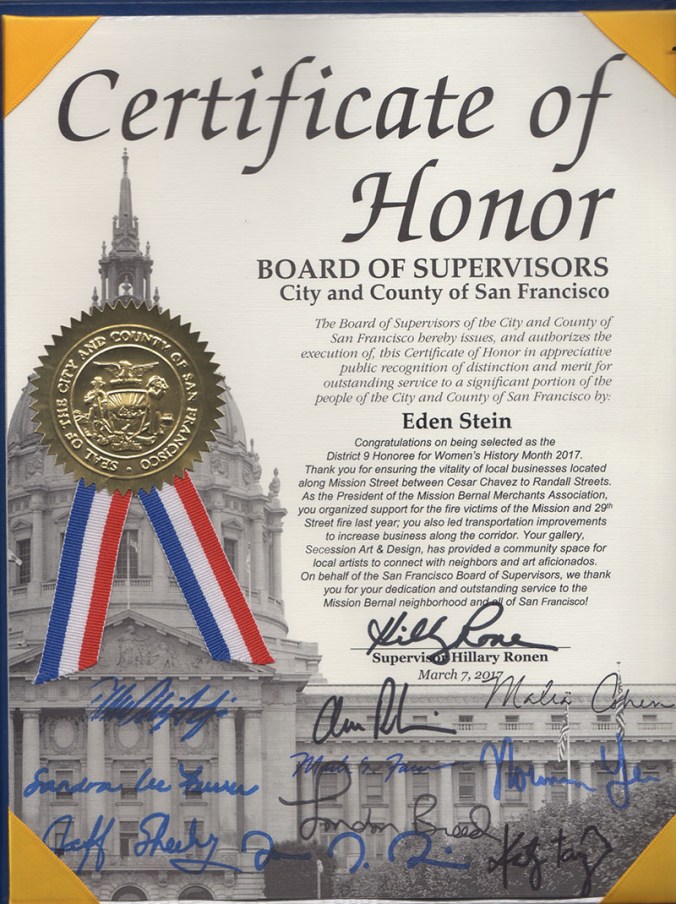 Last week, Bernal Neighbor Eden Stein was recognized at the San Francisco Board of Supervisors as a “Trailblazing Woman in Business and Labor.” Woo-hoo!