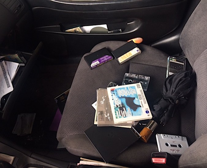 Well it’s obvious why you chose my car. Two-toned duck-tape holding up my passenger side mirror, on an old beat-up 2003 Nissan. Absolutely nothing inside but a few cassette tapes which you rummaged through and didn’t seem to appreciate. You stole nothing, but you left me a new umbrella. Thanks kindly.