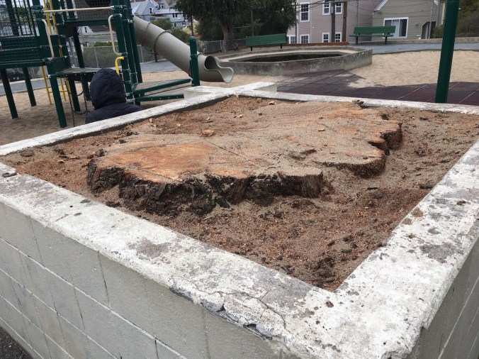 PHOTOS: Top, Bernal library playground with no tree, by Neighbor Melissa. Below, tree stump by Neighbor Kathryn