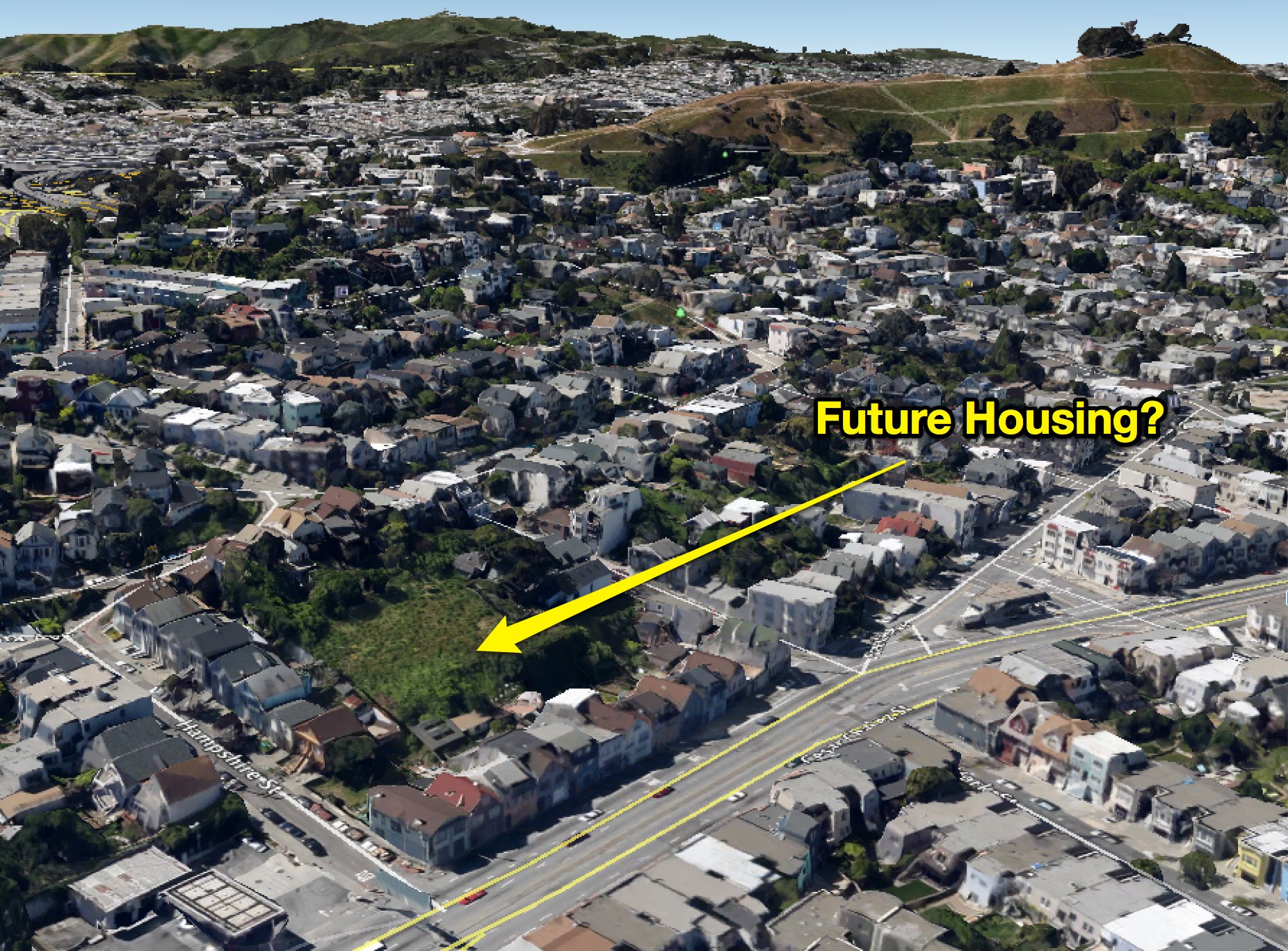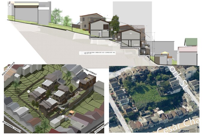 For several years decades, the owner of a large, interior lot bounded by Hampshire, Peralta, York and Cesar Chavez streets in northeast Bernal Heights has been trying to build new housing on the property. The last round of planning to build the infill homes took place in 2014 and 2015, but now the project is active again, with an all-new proposal and a design review board meeting slated to happen tonight, Thursday, May 4 beginning at 7 pm at the Bernal Heights Library. lower level(500 Cortland)