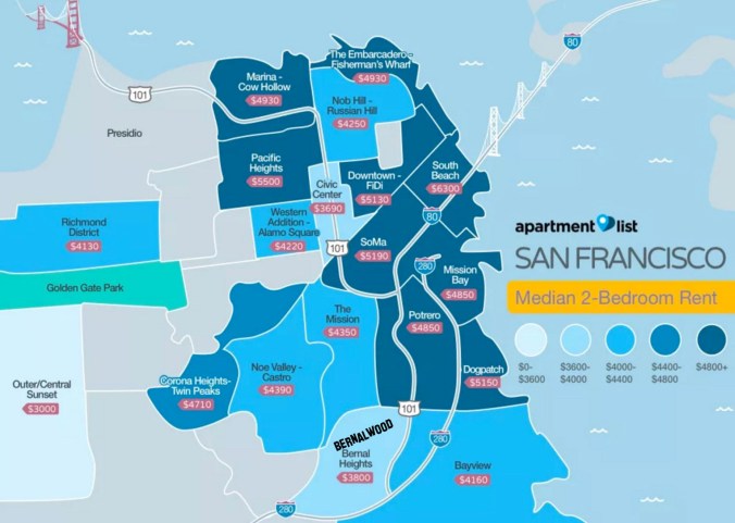 According to data compiled by Apartment List, an apartment rental listings service, the median rent for a two-bedroom apartment in Bernal Heights now hovers around $3800 — a nosebleed-inducing sum, but a good value compared to adjacent ‘hoods such The Mission ($4350), Potrero Hill ($4850), Noe Valley ($4390), and even Bayview(!!!), where 2BRs now go for $4160.