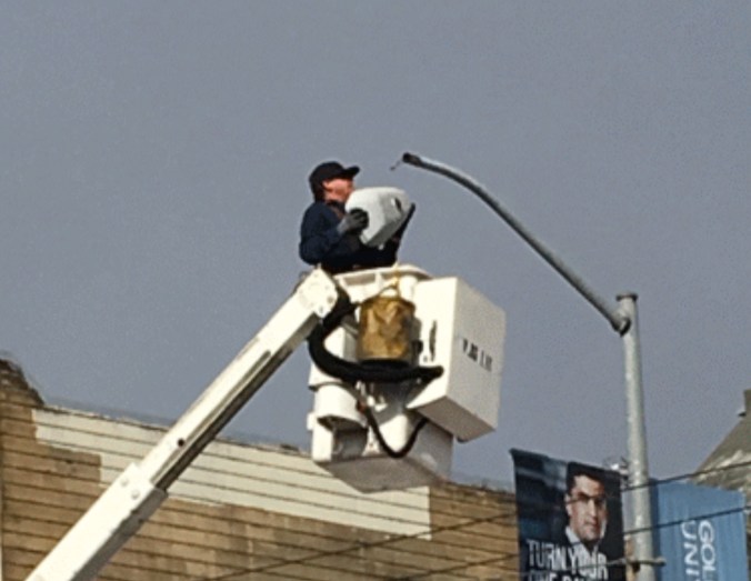 San Francisco is gradually replacing its old streetlights with new LED fixtures. La Lengua rebel propagandist Burrito Justice documented the transition on of one fixture Mission just south of Precita this morning.