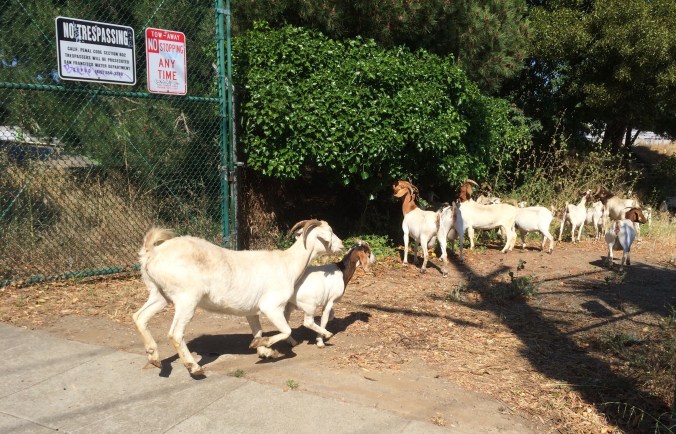 315 goats were delivered this morning at the water reservoir by the College Hill Learning Garden on Elsie. They will be there until Saturday. Another load will be delivered at 10:15 am. They are chowing down on all the weeds.