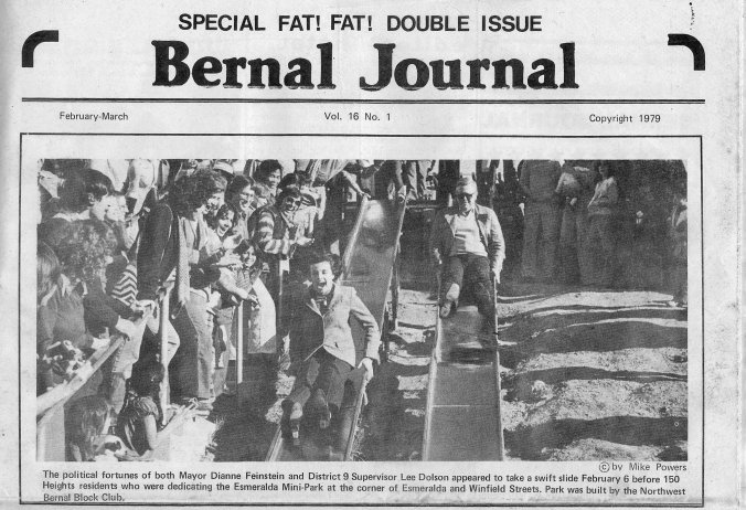 DiFi didn’t show up to reprise that feat on Saturday, but Bernal neighbor Michael Nolan was on hand to complete the circle between past and present. Neighbor Michael, of course, helped organize the effort to create the Esmeralda slides in the late 1970s: