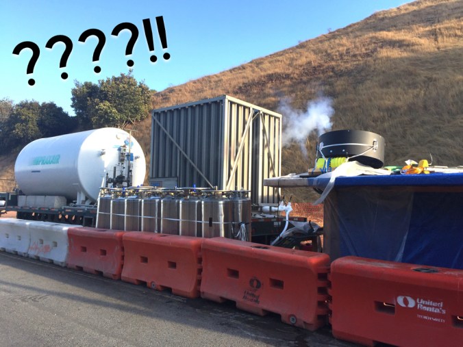 So on Bernal Hill, a contractor is using liquid nitrogen to freeze a segment of the mineral oil that functions as an insulator for the high-voltage electric line. The frozen segment acts like a cork to seal off the mineral oil backed up in the rest of the very long electric line. There’s another liquid nitrogen site farther north on Folsom that corked the other end of the line, and in-between, a third crew is repositioning the power line to avoid the new sewer pipes.