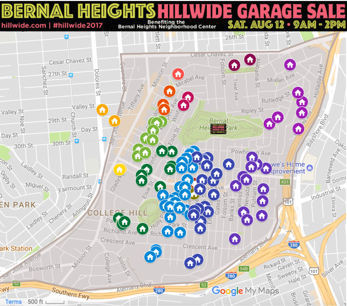 The fabulous 2017 Bernal Heights Hillwide Garage Sale is happening this Saturday, Aug. 12 from 9 am to 2 pm, so you still have a few days to add your home to the 2017 Treasure Map — or to begin mapping out your strategy to plunder all the many joyful things that will for sale.