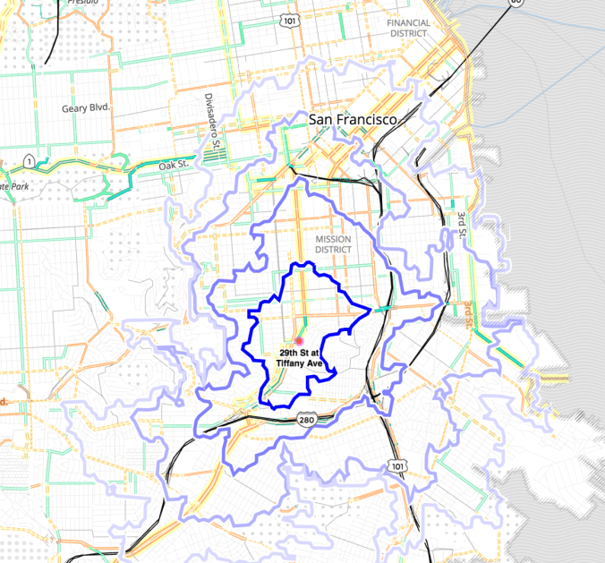 It’s pretty hard to get sense of how long it takes to ride places. How long does it take to bike a mile? Two miles? A half mile? I ride every day, and I still don’t have a great feel for distance. Anyway, there is one way to solve this: MAPS. (Shocking I know).There are these cool things called isochrones, which show travel distances of equal time as lines (thank the ancient Greeks, iso = equal, chronos = time). I happen to work for a mapping company that has an isochrone service, and now I know how to make these things.