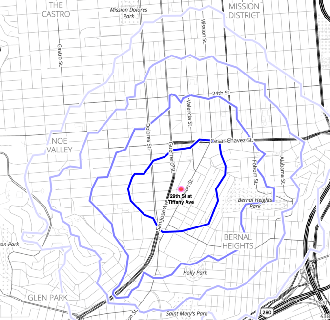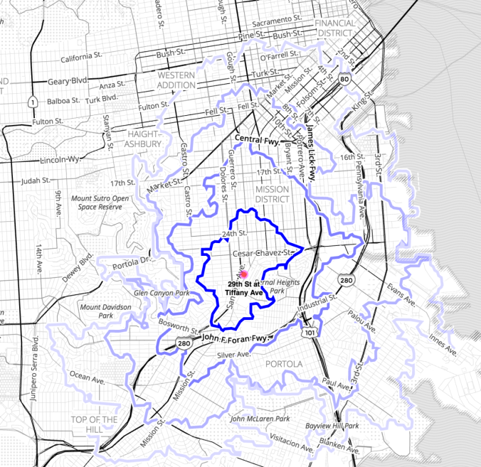 While I love to walk, it’s a haul. Here are 5/10/15/20 minute walking isochrones for La Lengua. (No wonder I never go to Noe Valley OMG SO FAR. And no wonder I rarely see the Valley People in La Lengua — you might as well need a visa.)