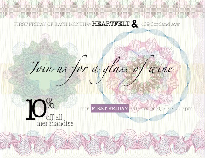 Neighbor Darcy Lee, proprietor of the fabulous Heartfelt stores on Cortland, is the kind of person who knows how to turn even a rainy day into a cause for celebration. This evening, Friday, Oct. 6 beginning at 6 pm, Neighbor Darcy will hail the arrival of the first Friday of the month by pouring elixir and taking 10% off the price of all the merchandise at Heartfelt &, her clothing store at 409 Cortland. All are invited.