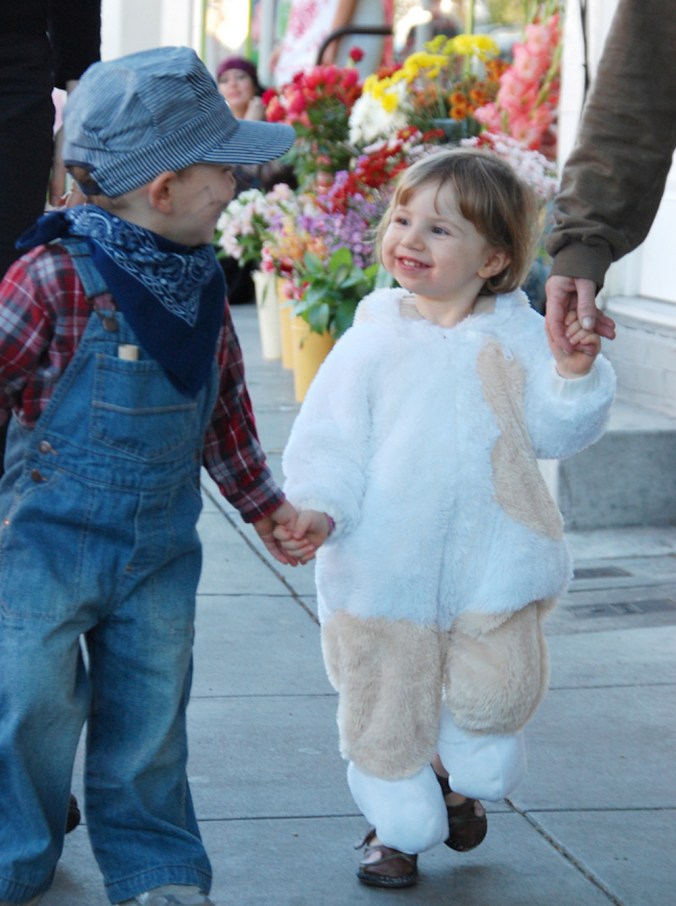 PHOTO: Bernalwood’s Cub Reporter with her best friend Eddie, learning about Halloween on Cortland in 2009. (Now much bigger, she’ll be on Cortland this year once again.) Photo by Telstar Logistics