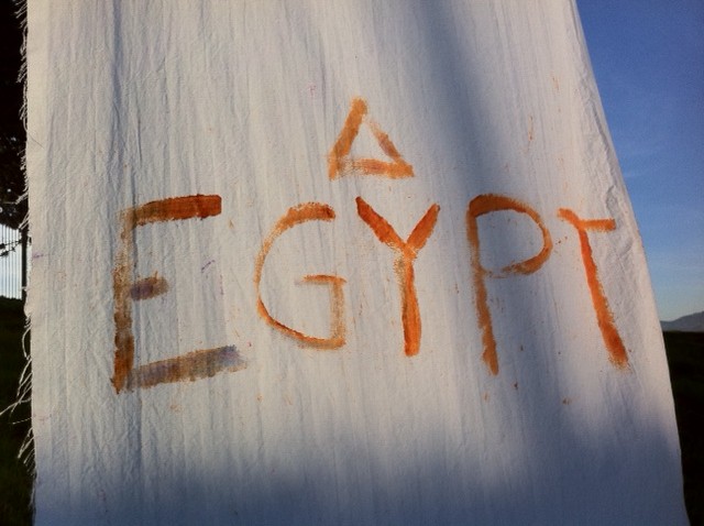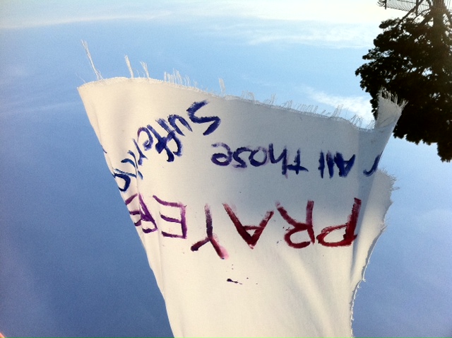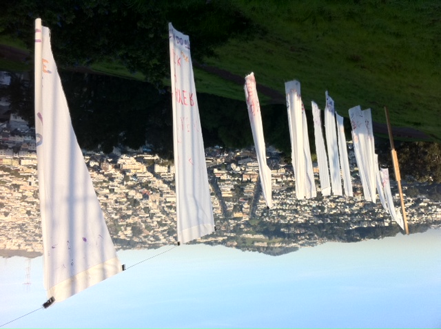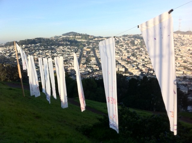 Our sources in the underground sent us these photos of a peace-oriented, conscousness-raising art/laundry installation that went up last night on Bernal Hill.