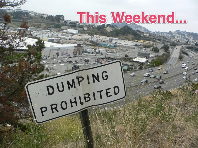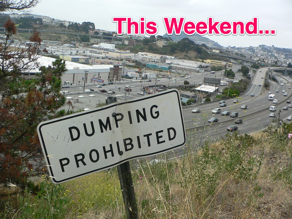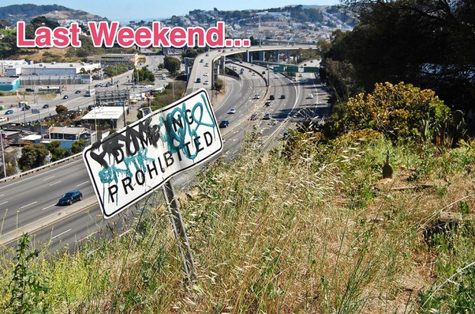 As you may recall, last week Bernalwood published a post about The Ugliest Spot in Bernal Heights, a barren patch of east slope hillside overlooking Highway 101 and the Spaghetti Bowl. Well, upon reading that post, a few of your Bernal neighbors decided to do something about it, and they volunteered to spend time on Saturday cleaning up the hillside mess. Yup, that’s right: They stepped up to clean the mess!