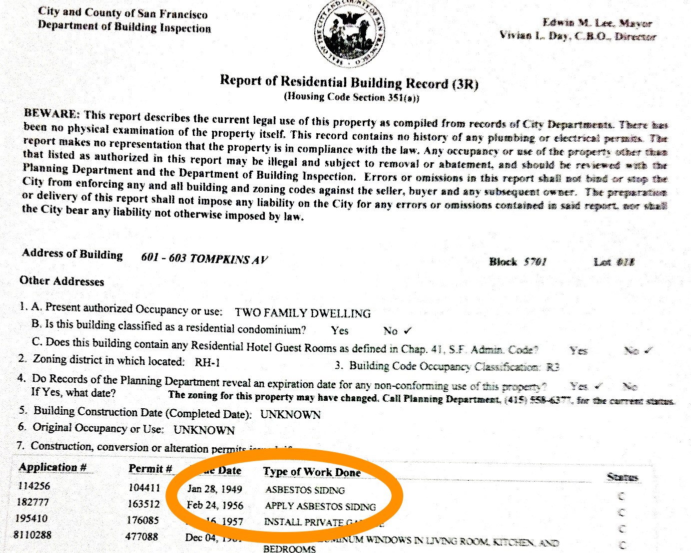 FACT: The ghost sign pre-dates the City’s 1965 regulations by at least a decade, and almost certainly more. How do we know this? Simple: The asbestos siding at 601 Tompkins was installed in 1949 and 1956, which means the sign was in place before it was covered over. And how do we know those dates? That’s simple too: Mr. Modolo has the permit history from the City’s Department of Building Inspection: