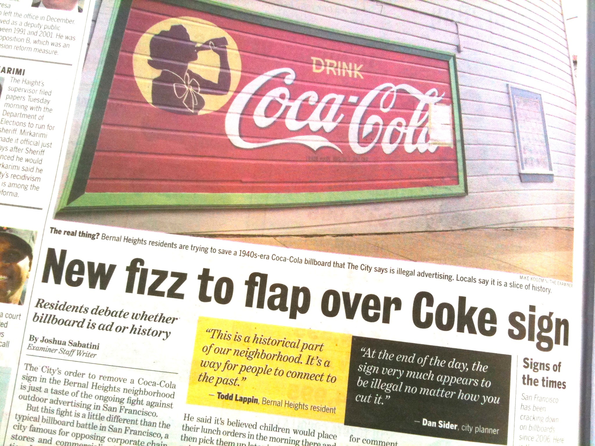 Supervisor David Campos’s office called today to share some very good news: Campos plans to introduce new legislation that will amend the City’s planning code to create a straightforward mechanism for preserving the historic-but-endangered Coca-Cola mural in Bernal Heights — as well as other historic signs throughout San Francisco. Wooot!