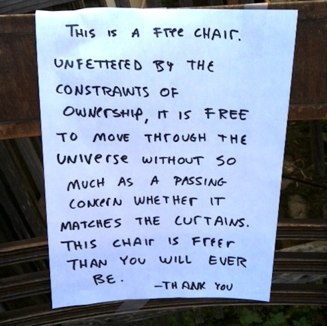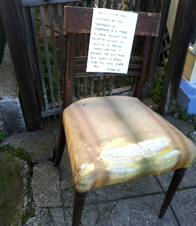 Neighbor Esther noticed this abandoned chair on Andover Street over the weekend. The chair is not likely to win design awards anytime soon, but it possesses great poise and an exceptional level of enlightenment regarding its own fate:
