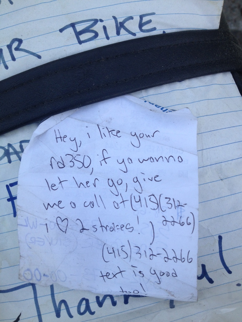 Apart from the initial complaint written on the note above, notice also (at the very top) the plea for leniency based on the bike’s classic stature.