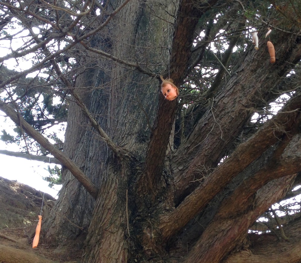 It appears Christmas and Halloween had a baby in July. Someone has gone to great lengths to decorate the large tree near Coso Gully with dismembered doll parts.