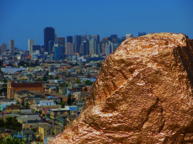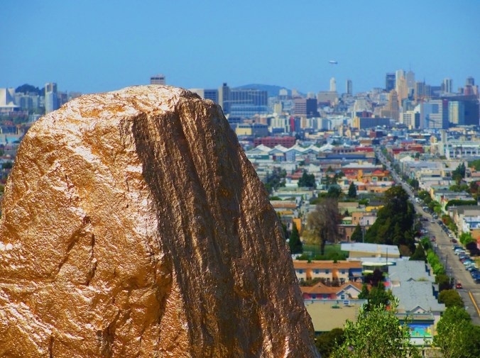 The anonymous creative genius who adopted the big rock on Bernal Heights Boulevard that overlooks downtown is always full of surprises. The latest is a sparkling paint job that makes the rock look like a giant gold nugget. Rather awesome.