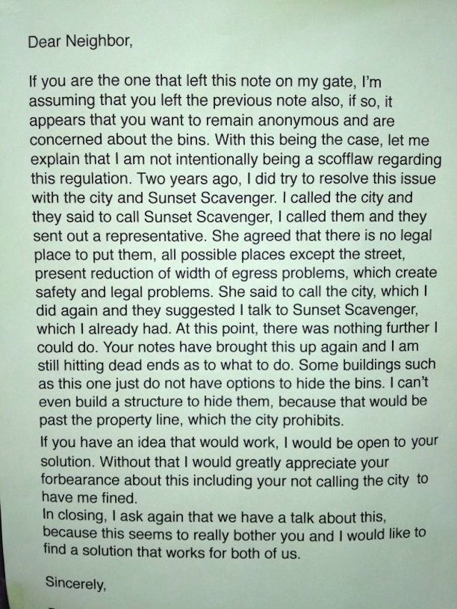 Sources tell Bernalwood that a response has now been posted to counter the anonymous and (debatably) passive-aggressive note that targeted a Bernal resident whose garbage cans are not hidden from the street.