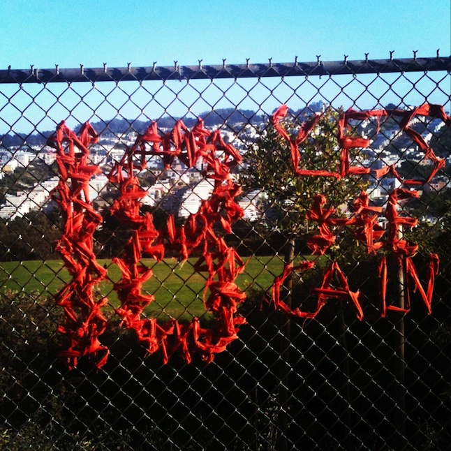Another Stitchbomb – this is a large-scale adaptation of my Golden Gate Bridge cross-stitch pattern, done at the top of beautiful Bernal Hill on a windy day. It’s lopsided because the girls decided, all of a sudden, that they are terrified of dogs. Please note: top of Bernal Hill is all dogs. I felt bad for them and mortified simultaneously, and worked frantically to get it done before they completely lost their marbles.