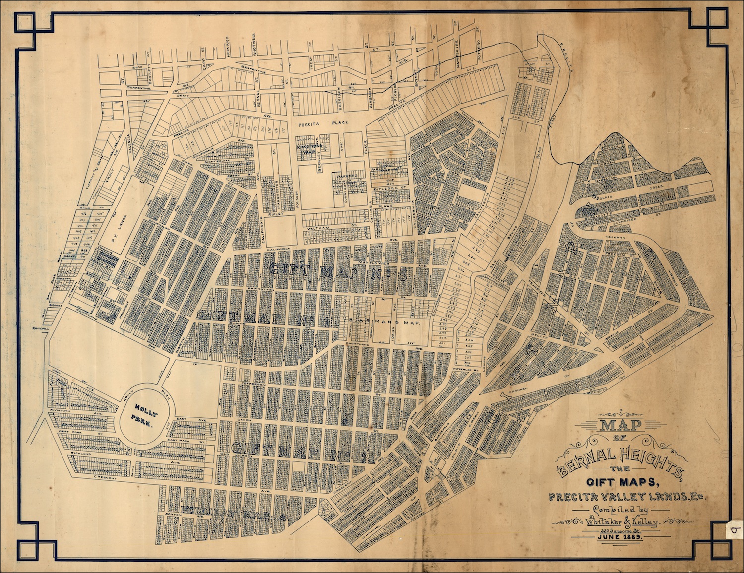 IMAGE: Historic map from 1889 clearly includes the so-called La Lengua territories with the geographic boundaries of Bernal Heights. (On the other hand, this same map also includes six different streets named California Avenue, so draw your own conclusions.)