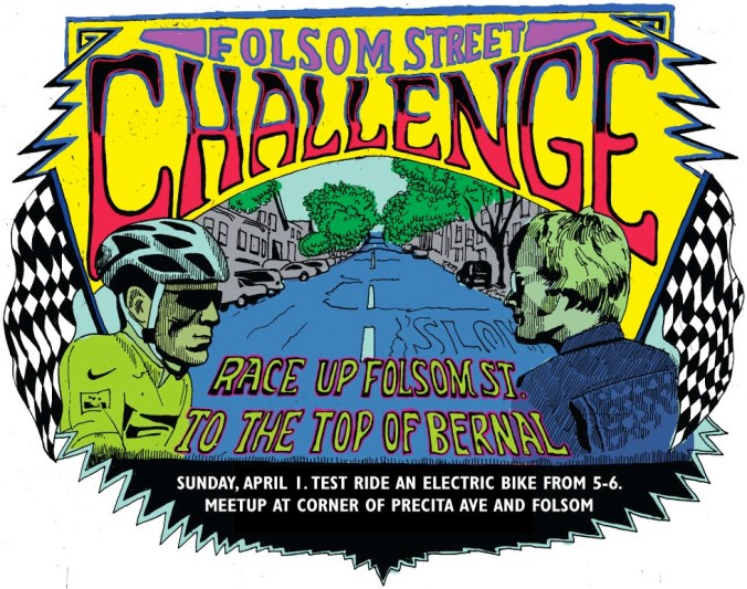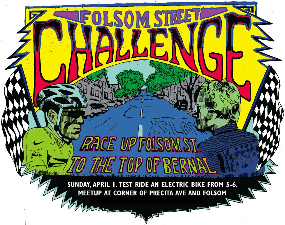 Yes, that’s right. The New Wheel has picked up the gauntlet Bernalwood threw down last January by making a few of their electric bikes available for you to take straight up that crazy-steep part of Folsom Street:
