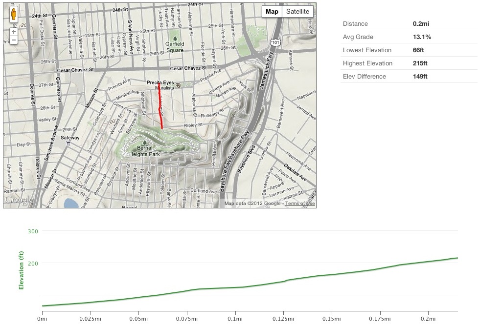 From Wool I looped around Bernal Heights Boulevard and coasted down to Precita Park. Then I turned around to head up, up, up that fearsomely steep section of Folsom Street.