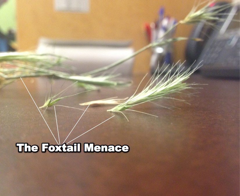 Foxtails are small plant awns or seed-bearing structures, usually of the genus Hordeum. Starting in the Spring and continuing through the Summer, plants shed them indiscriminately. We started to see a steady flow of foxtail cases in our veterinary practice mid-April, right after several days of heavy winds which helped yank the awns from their plants and spread them far and wide.