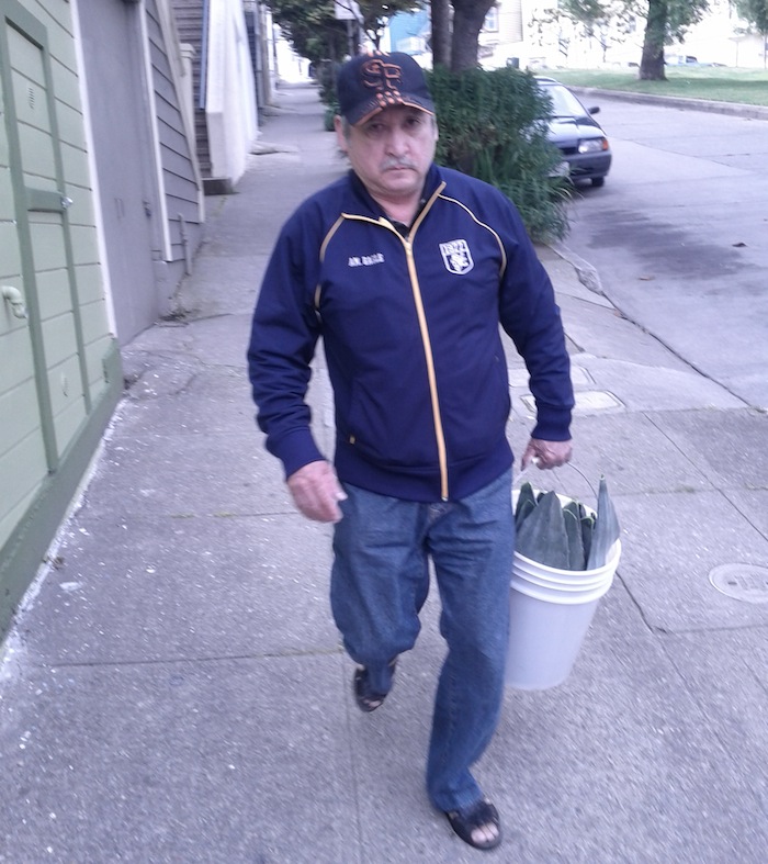 It’s actually just one of the bigger branches of the eucalyptus trees that line this block. One neighbor, who was heaving an axe at the obstruction within minutes, and who gave his name as “John Bunyan,” said the trees were planted in the seventies by another long-time Bernal resident, “who was feeling civic-minded.”
