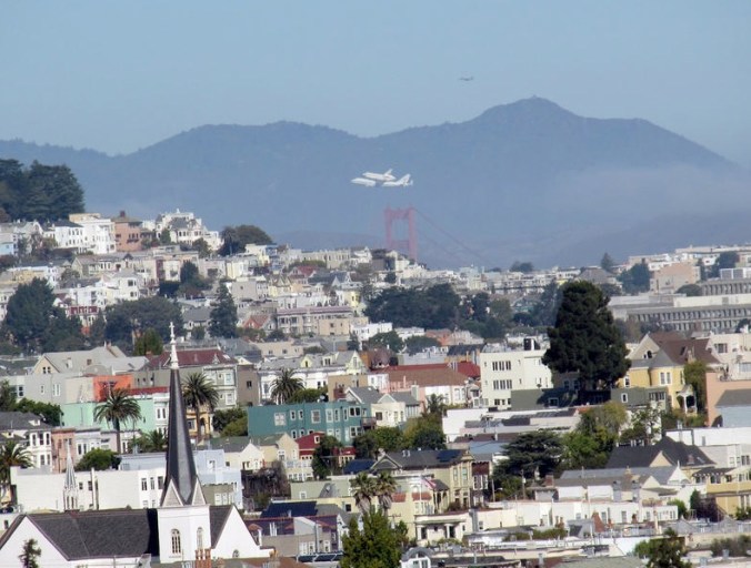 From atop the hill, Neighbor Charlie took this terrific shot of the shuttle floating past Sutro Tower: