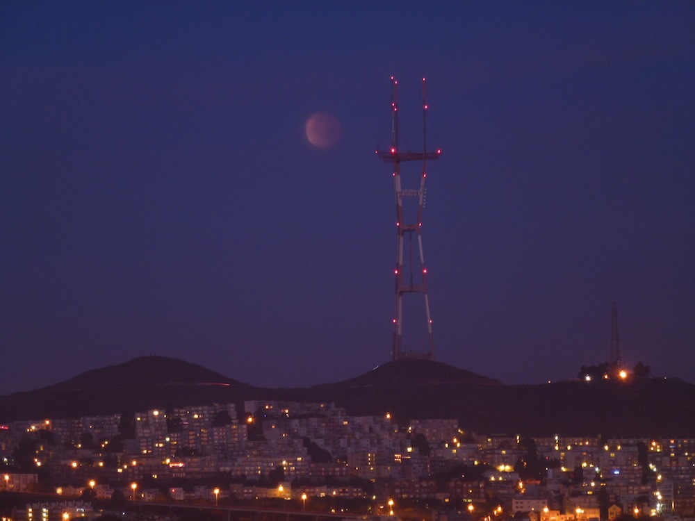 UPDATE: La Lengua rebel leader Burrito Justice also arose early to watch the eclipse, and he took some great photos from atop our Bernal Hill homeland. Sutro Tower and a disappearing moon… together at last!